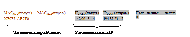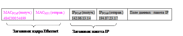 5. Протокол IP передает свой пакет и МАС-адрес получателя по межуровневому интерфейсу протоколу Ethernet, который формирует и отправляет по локальной сети кадр со следующими полями:
