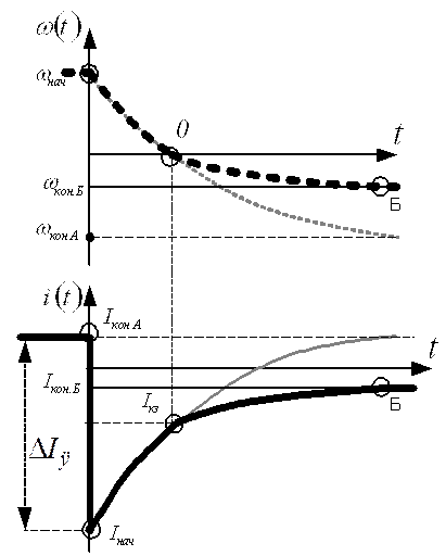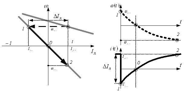 Рассматривая ПП при реактивном моменте на валу следует учитывать тот факт, что про изменении знака скорости знак приложенного к валу момента статического также изменяется, т.е. изменяются граничные условия. Поэтому при реактивном моменте на валу ПП следует рассматривать в два этапа.