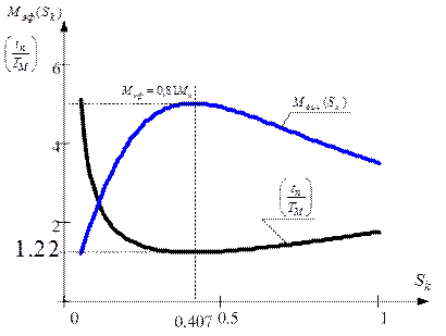 Рис. 1.4. Зависимости относительного времени пуска АД и эффективного электромагнитного момента от критического скольжения