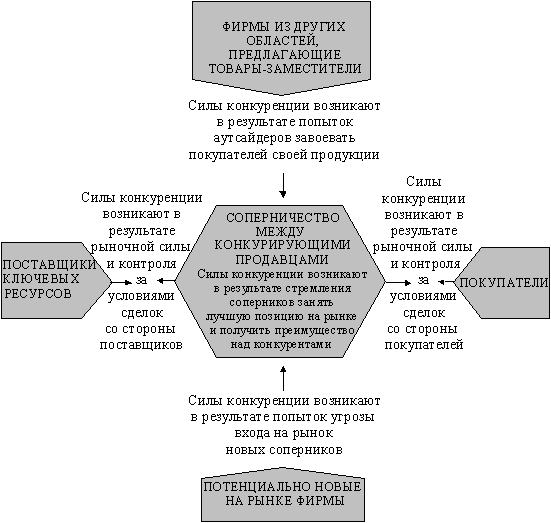 На каждом рынке характер конкуренции уникален, но ее проявления на всех рынках имеют много общего. В целом, конкуренция на рынке является результатирующей пяти перечисленных ниже сил (рис.2.1.):