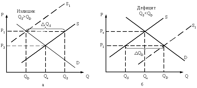 Чтобы избежать изменения цены, производители могут сократить предложение (S®S1), что приведет к сокращению объема до QD (рис. 6.1,а).