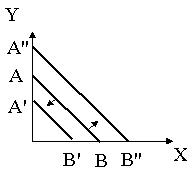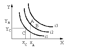 При движении из точки А в точку В увеличивается количество товара Х и снижается Y, то есть происходит замещение одного товара другим.