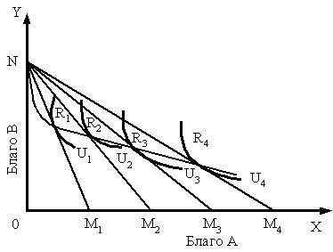 2. Оптимальный набор потребительских товаров и услуг должен предоставить потребителю их наиболее предпочтительное сочетание. Эти два условия сводят проблему максимизации удовлетворения потребностей потребителя к выбору подходящей точки на бюджетной линии. Это будет точка касания бюджетной линии и кривой безразличия.