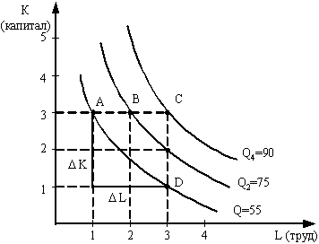 где DK и DL – изменения капитала и труда для отдельной изокванты, т.е. для постоянного Q.
