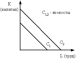 Фирма сталкивается с проблемой как достичь определенного объема производства с минимальными издержками. Предположим, что цена труда равна ставке заработной платы (w), а цена капитала равна арендной плате за оборудование (r). Издержки производства можно представить в виде изокост. Изокоста включает все возможные сочетания труда и капитала с равными валовыми издержками