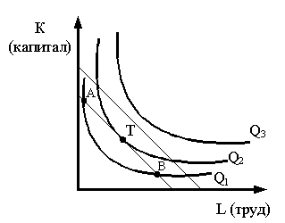 На графике равновесие фирмы отражает точка касания T изокванты с изокостой при Q2. Все другие сочетания факторов производства (A, B) могут дать меньший объем выпуска продукции.