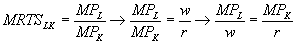 Учитывая, что в точке Т изокванта и изокоста имеют одинаковый наклон и что наклон изокванты измеряется MRTS, условие равновесия можно представить как