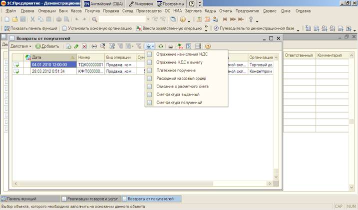 Если необходимо оформить операцию выдачи денежных средств покупателю за возвращенные им товары, то необходимо установить вид операции: "Возврат денежных средств покупателю". В этом случае РКО может быть выписан на основании документа "Возврат от покупателя", или документа "Заказ покупателя".