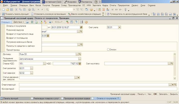 В зависимости от установленного вида операции с помощью данного документа может быть зафиксировано поступление наличных денежных средств по различным торговым операциям (см.рис.9):