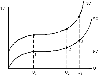 С ростом производства переменные издержки растут быстро. Объем Q1 характеризует необходимый технологический выпуск (минимум) продукции (рис. 12.1). При дальнейшем расширении производства (Q1–Q2) начинает сказываться экономия на масштабе (положительный эффект) и рост издержек становится уже более медленным, чем расширение производства. Объем Q2 показывает переход от оптимального производственного варианта (минимум затрат при максимуме объема) к затратному хозяйственному варианту. Это связано с действием заказа убывающей отдачи, когда переменные издержки обгоняют рост производства. Объем Q3 характеризует технический максимум в производстве продукции – это граница, больше которой выпускать нельзя, т.к. дальнейший рост затрат не приведет к росту объема выпуска.