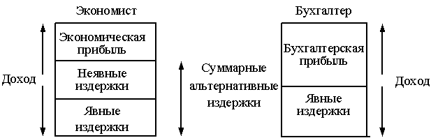 Рис. 13.1. Различия экономического и бухгалтерского подходов к издержкам и прибыли