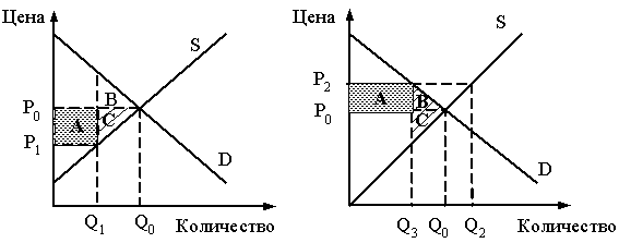 На рис. 14.6 и 14.7 треугольники В и С отражают полные убытки, связанные с государственным вмешательством в рыночное ценообразование.