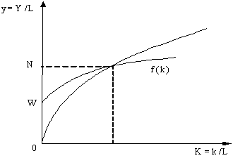 Капитал и труд вознаграждаются на основе соответствующих предельных производительных факторов. Вознаграждение капитала определяется тангенсом угла наклона к кривой f(K) в точке Р - предельная производительность капитала. Тогда WN - доля капитала в общем продукте; OW - доля заработной платы в продукте; OW - весь продукт.