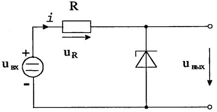 Для примера применения стабилитрона обратимся к схеме так называемого параметрического стабилизатора напряжения (рис. 2.7.). Легко заметить, что если напряжение uвх настолько велико, что стабилитрон находится в режиме пробоя, то изменения этого напряжения практически не вызывают изменения напряжения uвых (при изменении напряжения uвх изменяется только ток i, а также напряжение