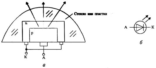 Устройство. Схематическое изображение структуры излучающего диода представлено на рис. 6.1,а, а его условное графическое обозначение – на рис. 6.2,б.
