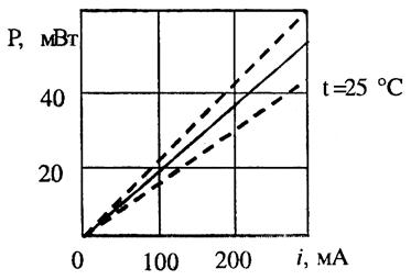 Для излучающих диодов, работающих не в видимом диапазоне, используют характеристики, отражающие зависимость мощности излучения Р от тока диода i. Зона возможных положений графика зависимости мощности излучения от тока для излучающего диода типа АЛ119А, работающего в инфракрасном диапазоне (длина волны 0,93…0,96 мкм), представлена на рис. 6.4.