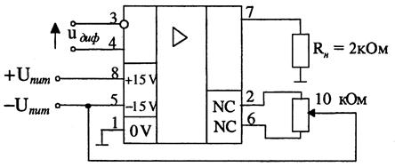 Для того, чтобы при нулевом сигнале на входе напряжение на выходе было равно нулю, т. е. для того, чтобы передаточная характеристика проходила через начало координат, предусматривают меры по компенсации напряжения смещения (балансировка, коррекция нуля, настройка нуля). В некоторых операционных усилителях для компенсации напряжения смещения предусмотрены специальные выводы. Типовая схема включения операционного усилителя типа К140УД8А, в котором предусмотрены такие выводы, представлена на рис. 7.7.