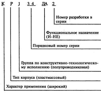 Система обозначений. Условное обозначение интегральных микросхем включает в себя основные классификационные признаки. Оно состоит из четырех элементов.