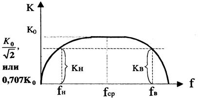 Амплитудно-частотная характеристика (АЧХ) усилителя – это зависимость модуля коэффициента усиления от частоты (рис. 9.3). Частоты fн и fв называются нижней и верхней граничными частотами, а их разность