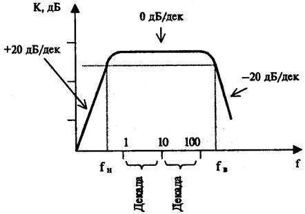 АЧХ может быть построена и в логарифмическом масштабе. В этом случае она называется ЛАЧХ (рис. 9.4), коэффициент усиления усилителя выражается в децибелах, а по оси абсцисс откладываются частоты через декаду (интервал частот между 10 f и f).