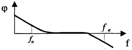 Фазо-частотная характеристика (ФЧХ) усилителя – это зависимость угла сдвига фаз между входным и выходным напряжениями от частоты. Типовая ФЧХ приведена на рис. 9.5. Она также может быть построена в логарифмическом масштабе.