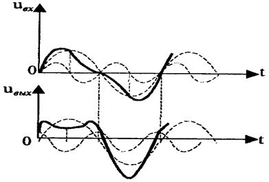 Пример возникновения фазовых искажений приведен на рис. 9.6, где показано усиление входного сигнала, состоящего из двух гармоник (пунктир), которые при усилении претерпевают фазовые сдвиги.
