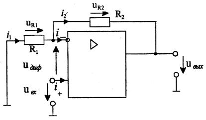 В соответствии с ранее принятыми допущениями входные токи ОУ равны нулю, т. е. i– = i+ = 0 и, следовательно, i1 = i2. Если ОУ работает в режиме усиления, тогда uдиф = 0.