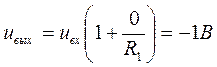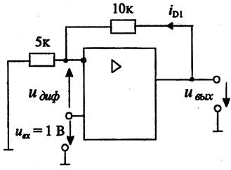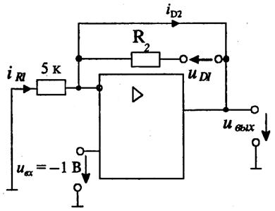 Пусть теперь uвх = –1 В. Предположим, что диод D1 закрыт, а диод D2 открыт. Тогда получим эквивалентную схему, приведенную на рис. 10.10, из которой получаем