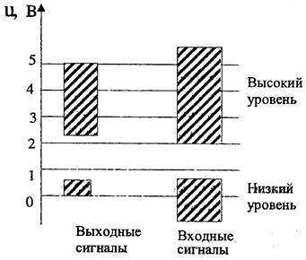 На этой диаграмме, соответствующей цифровым схемам транзисторно-транзисторной логики (ТТЛ), имеющей напряжение питания 5 В, укажем диапазоны напряжений для входных и выходных сигналов (заштрихованные прямоугольники). Это такие диапазоны, что сигнал, оказавшись в одном из них, безошибочно квалифицируется как сигнал высокого или низкого уровня. Высокому и низкому уровню сигналов ставятся в соответствие логические состояния 1 и 0. Если высокому уровню сигналов ставится в соответствие состояние 1, а низкому – состояние 0, то говорят о так называемой позитивной логике. Если высокому уровню соответствует состояние 0, а низкому – 1, то говорят о так называемой негативной логике.