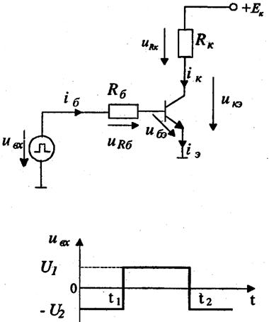 Ключи на биполярных транзисторах. Простейший ключ на биполярном транзисторе, включенный по схеме с общим эмиттером, и соответствующая временная диаграмма входного напряжения представлены на рис. 15.5.