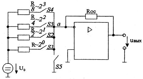 , что соответствует единице в первом и нулям в остальных разрядах. Модуль выходного напряжения пропорционален числу, двоичный код которого определяется состоянием ключей S1…S4. Токи ключей S1…S4 суммируются в точке «а» причем токи различных ключей различны (имеют разный «вес»). Это и определяет название схемы.