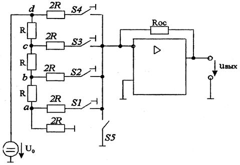 В схеме использованы так называемые перекидные ключи S1…S4, каждый из которых в одном из состояний подключен к общей точке, поэтому напряжения на ключах невелики. Ключ S5 замкнут только тогда, когда все ключи S1…S4 подключены к общей точке. Тогда напряжение относительно общей точки в каждой следующей из точек «а»…«d» в 2 раза больше, чем в предыдущей. К примеру, напряжение в точке «b» в 2 раза больше, чем в точке «а» (напряжение Ua, Ub, Uc и Ud в указанных точках определяются следующим образом: Ud=U0; Uc=U0/2; Ud=U0/4; Ua=U0/8). Допустим, что состояние указанных ключей изменилось. Тогда напряжения в точках «а»…«d» не изменится, так как напряжение между входами операционного усилителя практически нулевое.