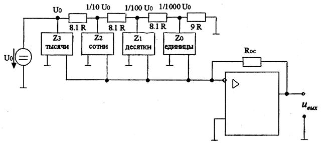 На рис. 18.7 приведена схема ЦАП для преобразования двоично-десятичных чисел.