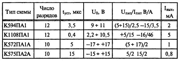 Наиболее распространенными являются ЦАП серий микросхем 572, 594, 1108, 1118 и др. В табл. 18.1 приведены параметры некоторых из них.