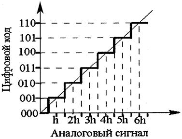 Квантование представляет собой округление аналоговой величины до ближайшего уровня квантования, т.е. максимальная погрешность квантования равна ±0,5h (h – шаг квантования).