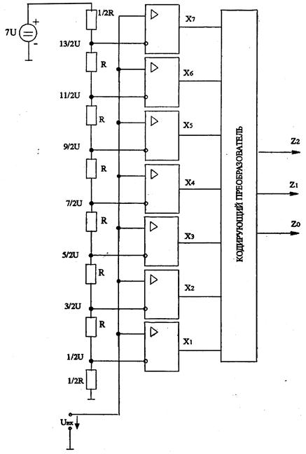 Рассмотрим АЦП с параллельным преобразованием входного аналогового сигнала (рис. 18.9). По параллельному методу входное напряжение одновременно сравнивают с n опорными напряжениями и определяют, между какими двумя опорными напряжениями оно лежит. При этом результат получают быстро, но схема оказывается достаточно сложной. Например, если Uвх>3/2U, но меньше 5/2U, то на выходе двух нижних ОУ появляется напряжение + Епит, что приводит к появлению на выходах кодирующего преобразователя (КП) кода 010.
