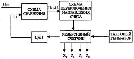 Настройка схемы такова, что обеспечивается примерное равенство напряжений на входе Uвх и на выходе ЦАП – U. Если входное напряжение Uвх больше напряжения U на выходе ЦАП, то счетчик переводится в режим прямого отсчета и код на его выходе увеличивается, обеспечивая увеличение напряжения на выходе ЦАП. В момент равенства Uвх и U счет прекращается и с выхода реверсивного счетчика снимается код, соответствующий входному напряжению.