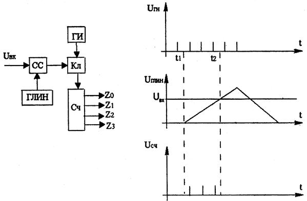 Принцип действия рассматриваемого АЦП основан на подсчете числа импульсов в отрезке времени, в течение которого линейно изменяющееся напряжение (ЛИН), увеличиваясь от нулевого значения, достигает уровня входного напряжения Uвх. Используются следующие обозначения: СС – схема сравнения; ГИ – генератор импульсов; Кл – электронный ключ; Сч – счетчик импульсов. Отмеченный на временной диаграмме момент времени t1 соответствует началу измерения входного напряжения, а момент времени t2 – равенству входного напряжения и текущего напряжения ГЛИН. Погрешность измерения определяется шагом квантования времени. Ключ Кл подключает к счетчику генератор импульсов от момента начала измерения до момента равенства Uвх и UГЛИН. Через UСч обозначено напряжение на входе счетчика. Код на выходе счетчика пропорционален входному напряжению. Одним из недостатков этой схемы является невысокое быстродействие.