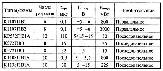 Наиболее распространенными являются АЦП серий микросхем 572, 1107, 1138 и др. (табл. 18.2).