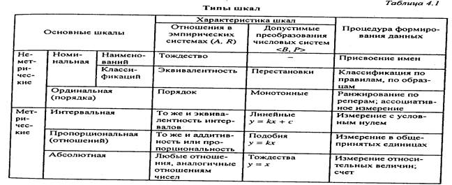 Шкала М представляет собой совокупность правил, позволяющих выполнить указанное сопоставление. Она характеризуется группой допустимых преобразований числовой системы. Основные типы шкал приведены в табл. 4.1;