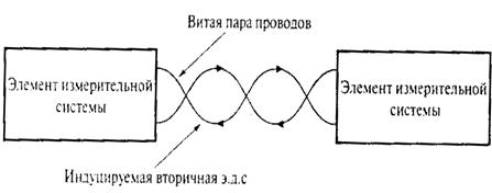 1. Использование витых пар проводов. Элементы измерительной системы соединяются витыми парами проводов (Рис. 6.1). Изменение магнитного поля будет индуцировать вторичную э.д.с. одного направления и величины в обоих проводах каждой части витой пары. Но если в одном проводе пары наведенная э.д.с. совпадает с направлением э.д.с. основного тока, то в смежном проводе пары ее направление противоположно основной э.д.с. Таким образом, результат влияния наведенных э.д.с. станет нулевым.