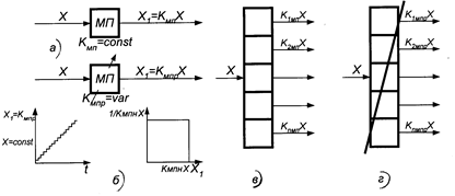 Регулируемые масштабные преобразователи (рис.5.3, б, г) отличает от нерегулируемых (рис.5.3, а, в) возможность изменения коэффициента преобразования Кмп. Многоканальные масштабные преобразователи могут быть с временным (рис.5.3, б) и пространственным разделением (рис.5.3, в, г).