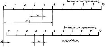 Одним из вариантов первого метода сопоставления является метод одноэтапного нониуса, основанный на использовании двух многоканальных нерегулируемых мер с различными шагами квантования q1 и q2. Метод используется при х<q1.