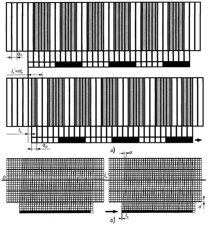 Метод растра предполагает использование двух многоканальных мер в виде прозрачных линеек (рис. 5.10, а) с близкими размерами шага квантования