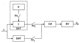 Структурная схема одного из вариантов реализации тестового метода показана на рис.8.8. В состав используемых средств помимо средства измерений и вычислительного устройства ВУ входят блоки формирования БАТ и БМТ аддитивного и мультипликативного тестов и коммутирующие ключи Кл1, Кл2, Кл3, с помощью которых осуществляются такты процесса измерения. На первом такте при разомкнутых ключах Кл1, Кл3 и замкнутом Кл2 на СИ подается непосредственно входная величина x. Во втором такте замыкается ключ Кл1 и на вход СИ подается аддитивный тест x+q. В третьем такте ключ Кл2 размыкается, а ключ Кл3 замыкается и на вход СИ подается мультипликативный тест kx.