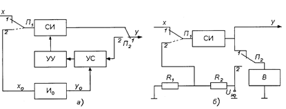 Рис. 8.11. Схемы реализации метода калибровки: а – с образцовым источником сигналов, б – с образцовым делителем напряжения; СИ – средство измерений; УУ – устройство управления; УС – устройство сравнения; В – вычитатель; ИО – источник образцового сигнала