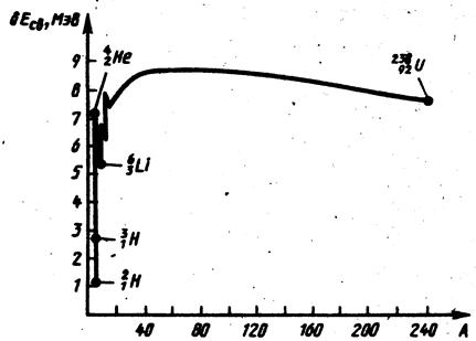 . Она характеризует устойчивость атомных ядер. Чем она больше, тем устойчивее ядро. Удельная энергия связи зависит от массового числа