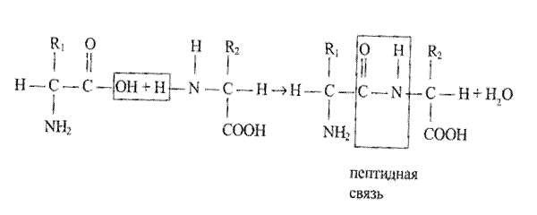 Образовавшееся соединение аминокислот называется пептидом, а ковалентная связь между ними — пептидной связью. Все белки представляют собой полипептиды, т. е. цепи, состоящие из многих десятков и даже сотен аминокислотных звеньев. Из 20 видов аминокислот можно построить огромное количество белков, точно так же как из 20 букв алфавита можно составить множество слов, смысл которых будет зависеть от того, из каких букв они составлены, в каком количестве взяты и в каком порядке установлены. Свойства же молекулы белка определяются составом аминокислот, числом аминокислотных звеньев, а также порядком их следования в цепи.