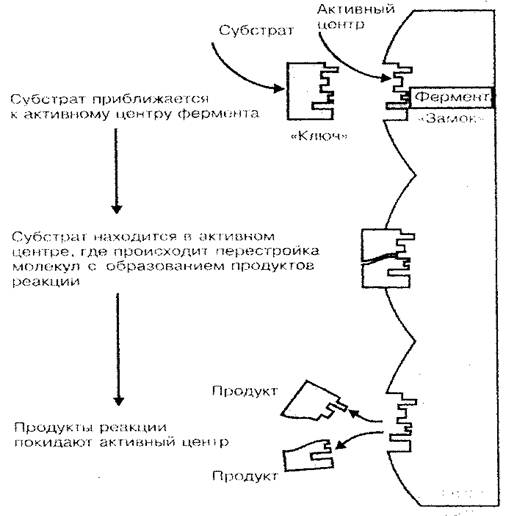 Одна из основных функций белка — ферментативная. Ферменты — это биологические катализаторы или ускорители химических реакций, проходящих в живом организме. Как известно, скорость химических реакций существенным образом зависит от концентрации веществ, а также температуры среды, в которой эти реакции протекают. Если учесть, что жизнь клетки (организма) — это совокупность огромного количества реакций синтеза и распада, которые составляют обмен веществ, то становится понятной огромная роль белков-ферментов в процессах жизнедеятельности организма на всех его уровнях. Только благодаря ферментам, при сравнительно низкой температуре организма и малой концентрации веществ в его клетках и тканях химические реакции протекают с достаточно большой скоростью (ферментативная реакция протекает в 100—1000 раз быстрее, нежели в среде без ферментов). Каталитическую активность белка-фермента обуславливает не вся молекула, а только ее небольшая часть, называемая активным центром. Пространственная структура активного центра как ключ к замку подходит по форме к пространственной структуре катализируемого вещества (субстрата), именно этим объясняется специфичность белков-ферментов (рис. 3).