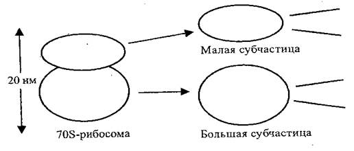 Каждая рибосома состоит из двух субъединиц – большой и малой, построенных из рибосомной РНК и белков. По массе рибосомной РНК в рибосоме больше – из нее построены каркасы большой и малой субъединиц, к которым в определенном порядке присоединены молекулы белков.